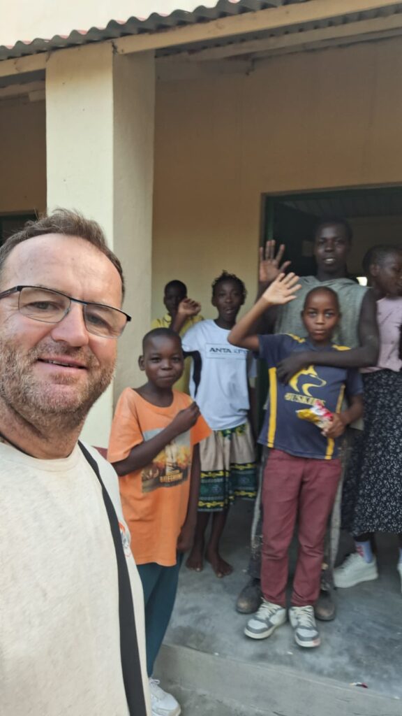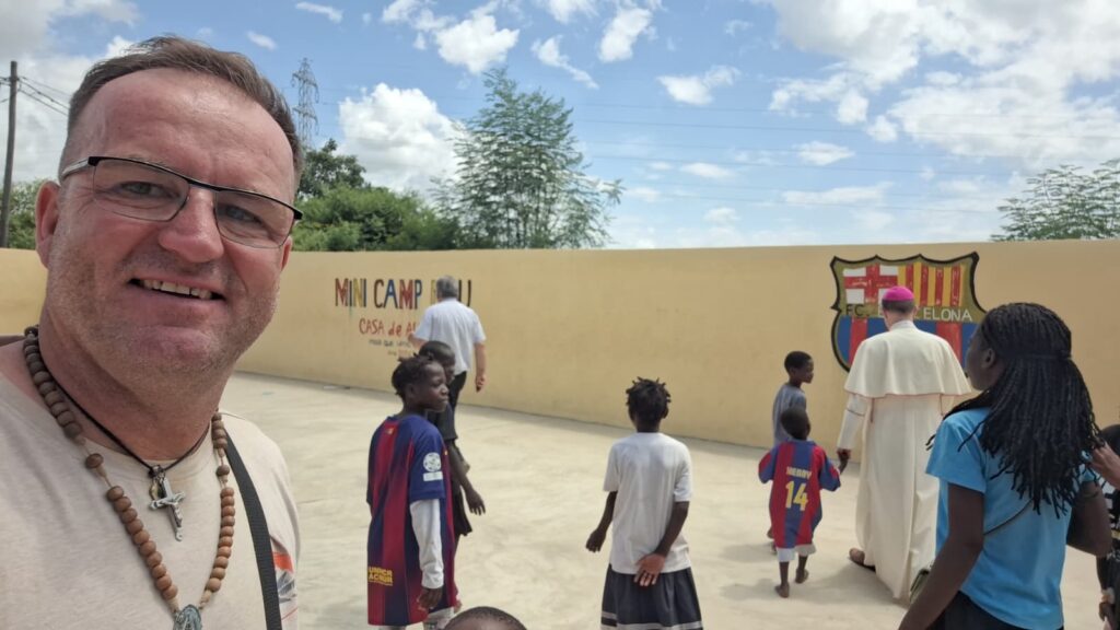 misionár a spráca Kliniky sv. Pátra Pia, Mgr. Peter Pagáč s deťmi, v priestore malého prislúchajúceho futbalového ihriska